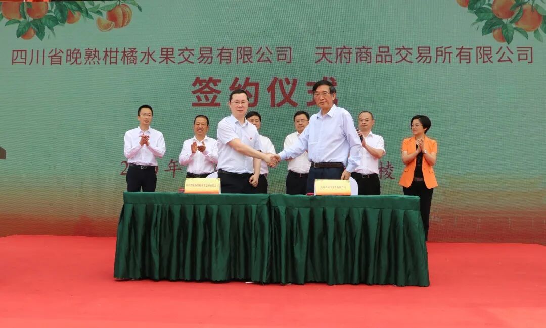 仪式现场,四川省晚熟柑橘水果交易有限公司与天府商品交易所有限公司达成合作意向,并成功签约。双方就丹棱晚熟柑橘交易服务中心项目展开深度合作。天府商品交易所有限公司将充分发挥平台优势,以丹棱最具代表性的大宗特色产品晚熟柑橘为主,助力丹棱开展晚熟柑橘等大宗实物商品、仓单、订单等交易业务,并配套相应的产品标准认证、种植标准化技术推广、完善的冷链物流仓储及供应链金融等增值服务,并同步培训和发展当地晚熟柑橘经纪人队伍,进一步发挥地方特色优势,擦亮“丹棱桔橙”金字招牌,扩大品牌宣传力,提升丹棱桔橙美誉度,最终将该中心建设成为一个功能完善、运作规范、特色鲜明、在全国有较强影响力的晚熟柑橘交易及全产业链服务中心。